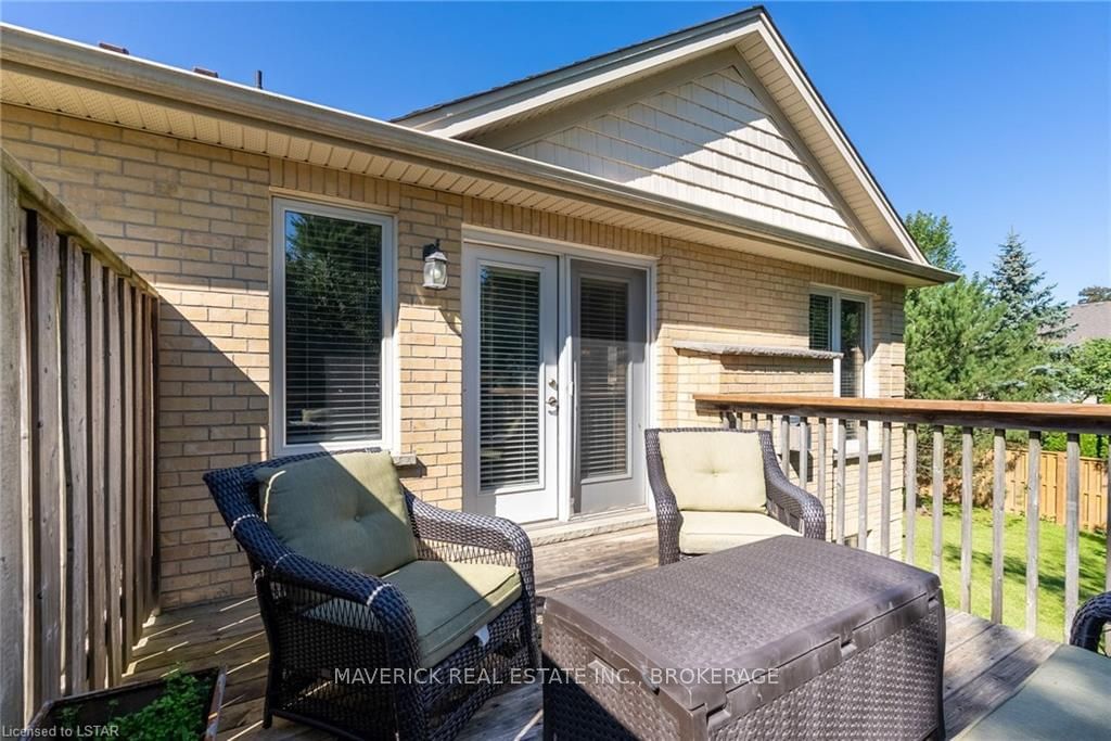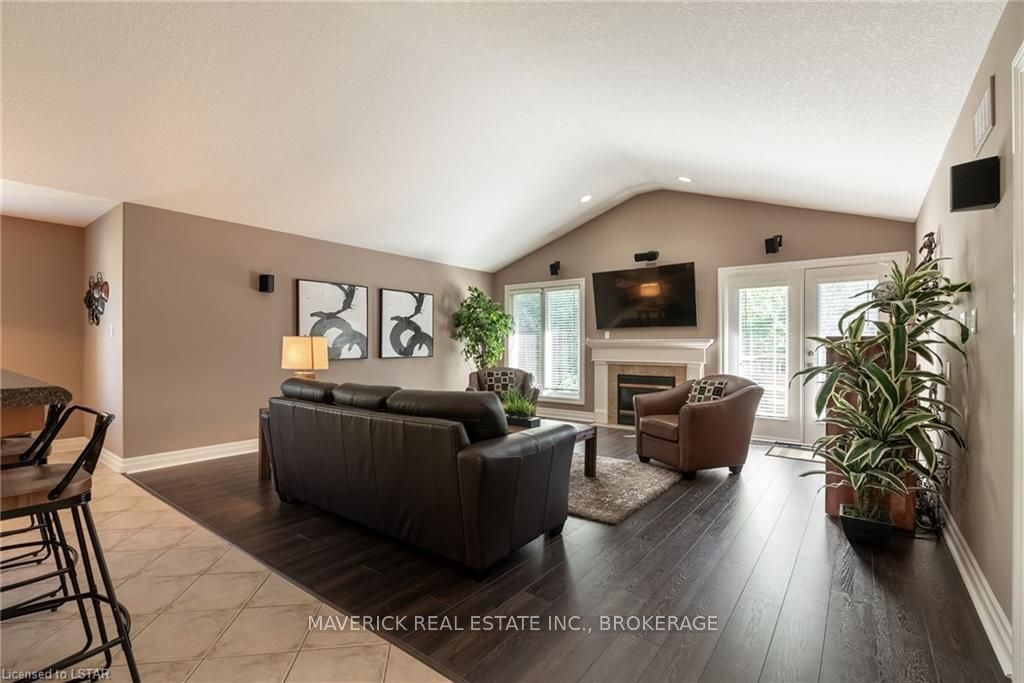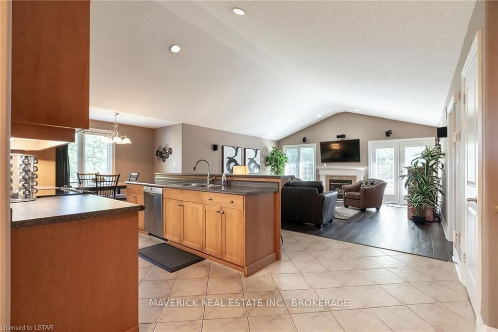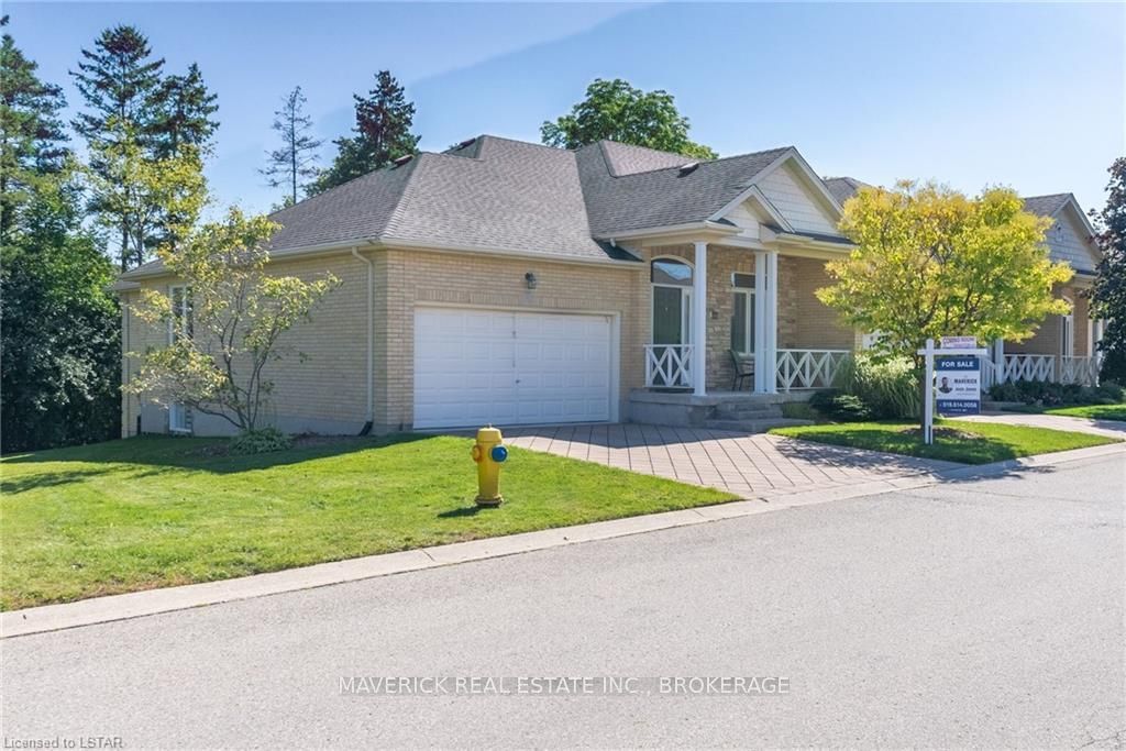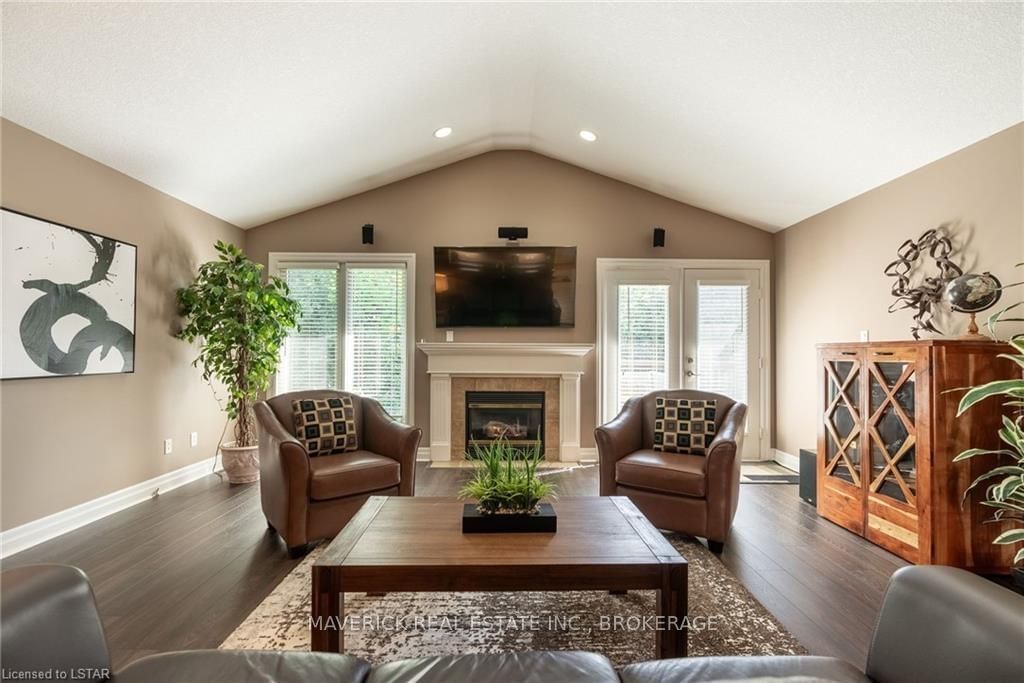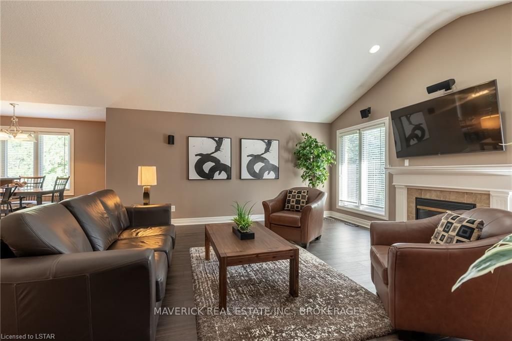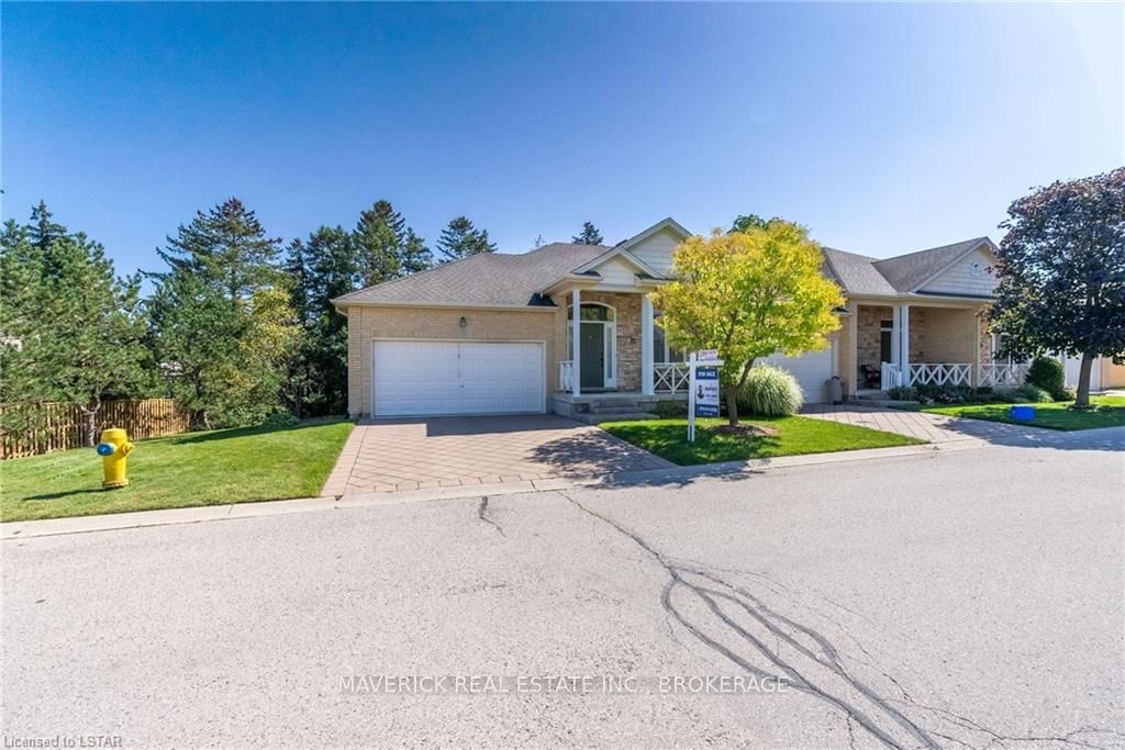 48 HR ESCAPE CLAUSE- Introducing a stunning gem nestled in a quiet community, this solid brick one-floor condominium offers the perfect blend of comfort and style. With nearly 1,500 sq ft of above grade living space PLUS a finished basement , this end unit provides a sense of privacy and tranquility. As you step inside, you'll be greeted by a wide open concept design and vaulted ceiling that seamlessly connects the kitchen, dining area, and living room. The spacious kitchen features a breakfast island, ideal for casual dining, while overlooking the inviting living room, complete with a cozy gas fireplace and seven mounted speakers for an immersive surround sound experience. The main floor also boasts a dedicated dining area, perfect for entertaining guests. For those seeking outdoor relaxation, you'll love the access to the elevated fully enclosed deck, offering ultimate privacy and a serene view of the tree-lined back fence. This home has undergone recent upgrades, with all carpets on the main floor replaced with laminate flooring, providing a modern and low-maintenance touch. The main floor features two generously sized bedrooms, including a large primary bedroom with a walk-in closet and a luxurious 5-piece ensuite bathroom. The convenience of main floor laundry is also found in the common 4 pc bathroom. The basement of this home has been professionally finished in 2021, featuring recessed LED pot lights and a custom cherry bar with an additional separate wet bar, perfect for hosting gatherings or enjoying a relaxing evening. An additional bedroom with a closet offers flexibility and extra space as well. The basement also showcases large 4ft x4ft windows that welcome loads of natural light and provide beautiful views of the green space behind, creating a peaceful ambiance. Four built-in speakers complete the basement's impressive features. If one floor living in a quiet, peaceful neighbourhood in the West end of London is what you are looking for, this is it!