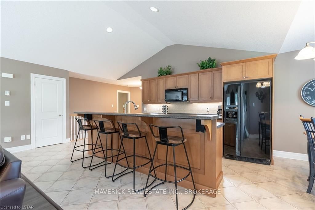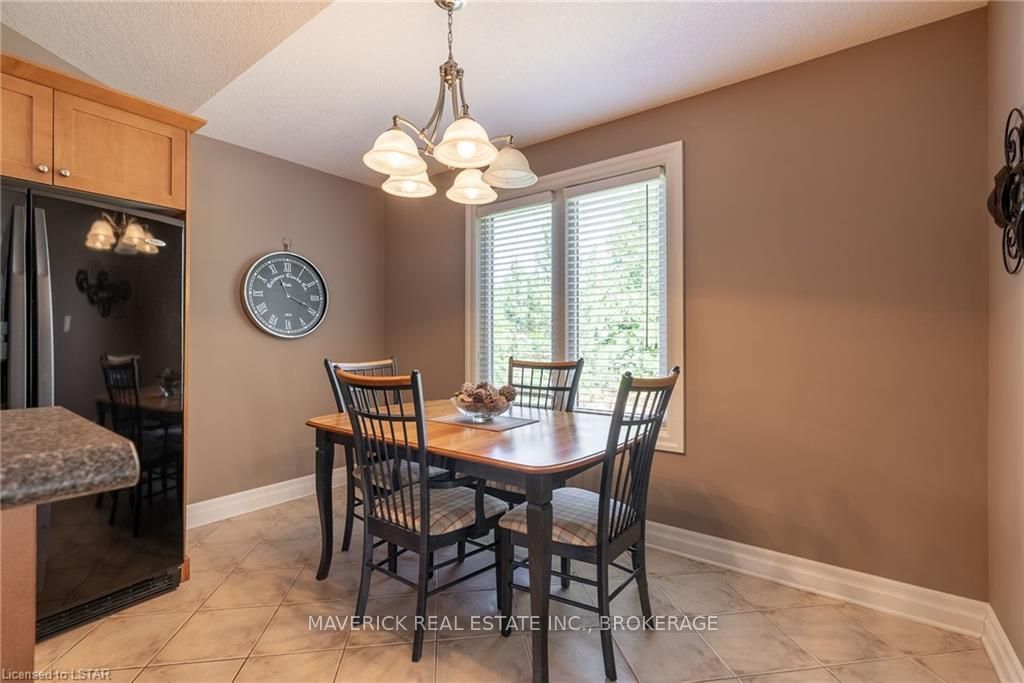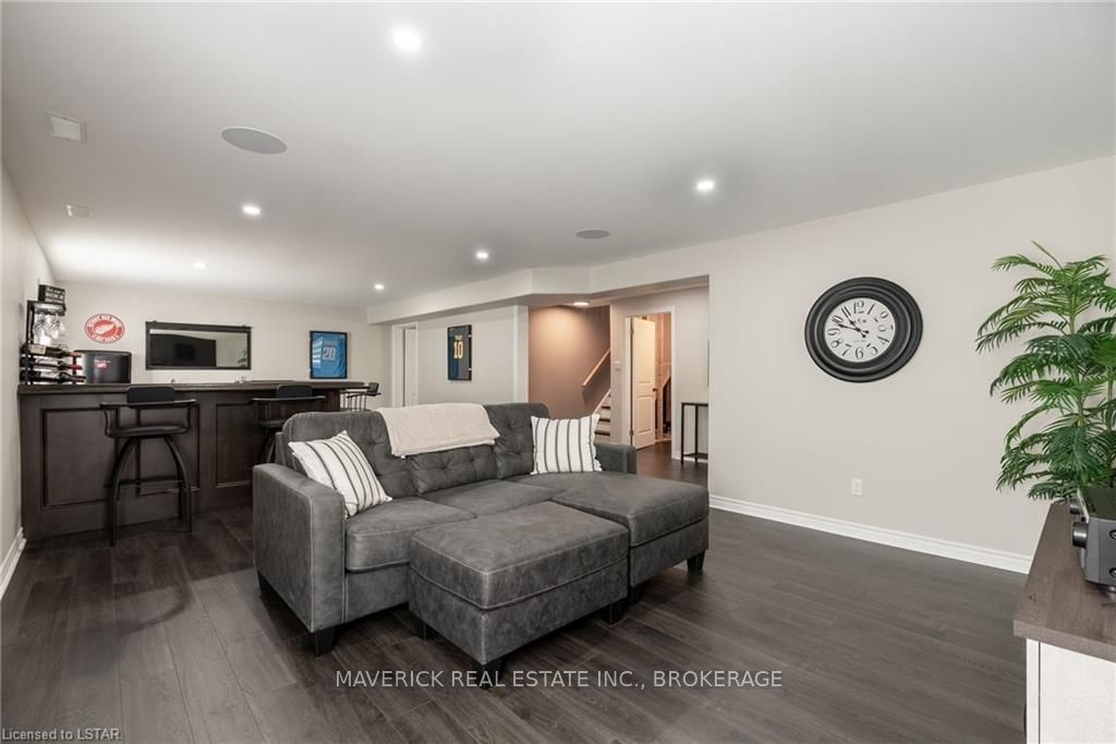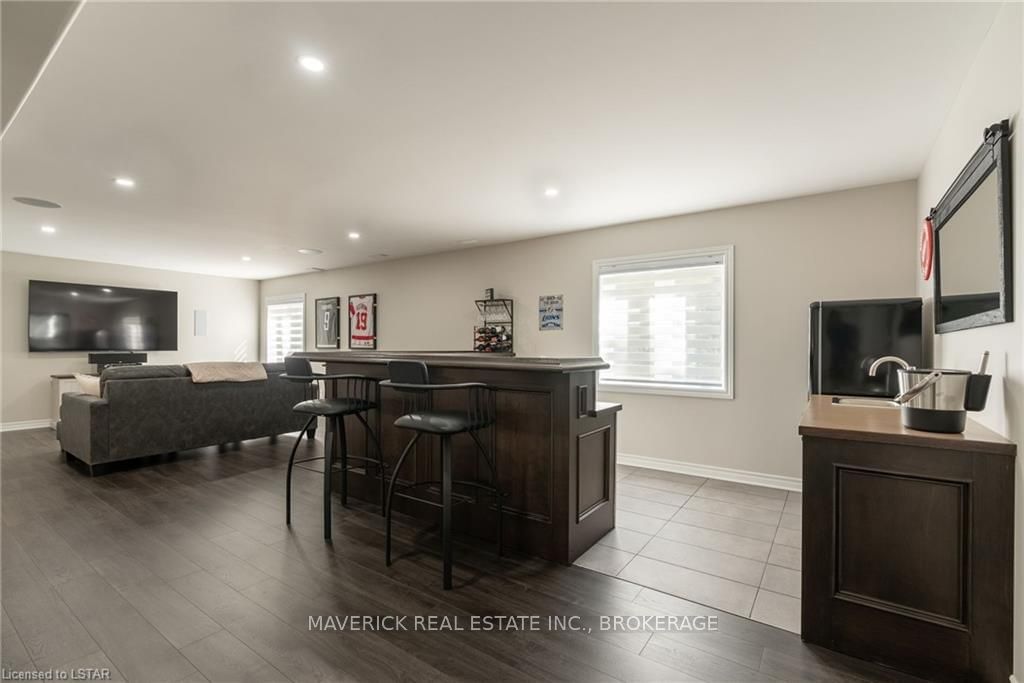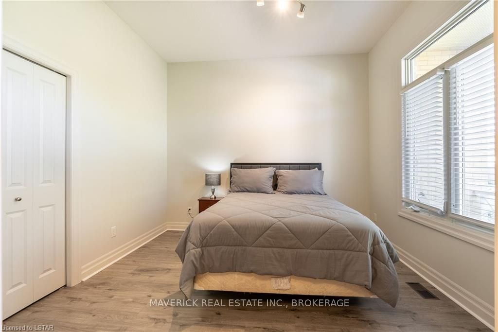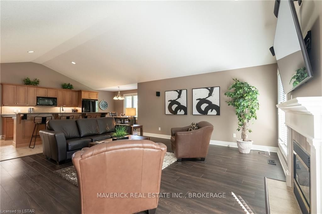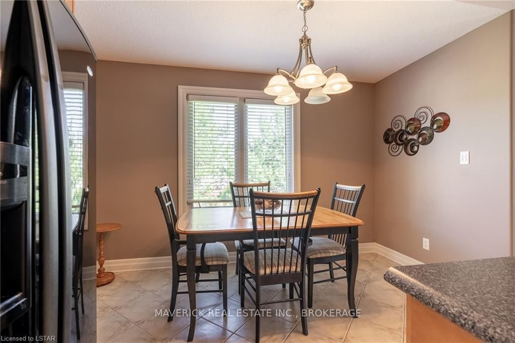 48 HR ESCAPE CLAUSE- Introducing a stunning gem nestled in a quiet community, this solid brick one-floor condominium offers the perfect blend of comfort and style. With nearly 1,500 sq ft of above grade living space PLUS a finished basement , this end unit provides a sense of privacy and tranquility. As you step inside, you'll be greeted by a wide open concept design and vaulted ceiling that seamlessly connects the kitchen, dining area, and living room. The spacious kitchen features a breakfast island, ideal for casual dining, while overlooking the inviting living room, complete with a cozy gas fireplace and seven mounted speakers for an immersive surround sound experience. The main floor also boasts a dedicated dining area, perfect for entertaining guests. For those seeking outdoor relaxation, you'll love the access to the elevated fully enclosed deck, offering ultimate privacy and a serene view of the tree-lined back fence. This home has undergone recent upgrades, with all carpets on the main floor replaced with laminate flooring, providing a modern and low-maintenance touch. The main floor features two generously sized bedrooms, including a large primary bedroom with a walk-in closet and a luxurious 5-piece ensuite bathroom. The convenience of main floor laundry is also found in the common 4 pc bathroom. The basement of this home has been professionally finished in 2021, featuring recessed LED pot lights and a custom cherry bar with an additional separate wet bar, perfect for hosting gatherings or enjoying a relaxing evening. An additional bedroom with a closet offers flexibility and extra space as well. The basement also showcases large 4ft x4ft windows that welcome loads of natural light and provide beautiful views of the green space behind, creating a peaceful ambiance. Four built-in speakers complete the basement's impressive features. If one floor living in a quiet, peaceful neighbourhood in the West end of London is what you are looking for, this is it!