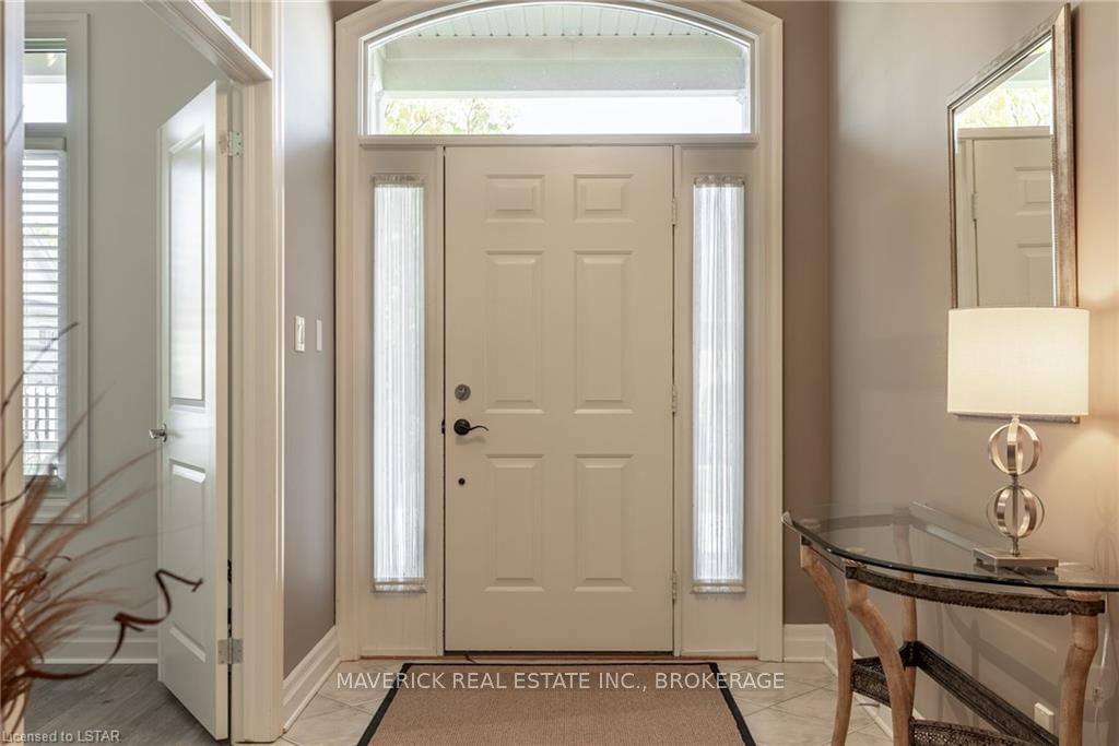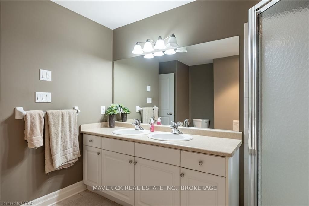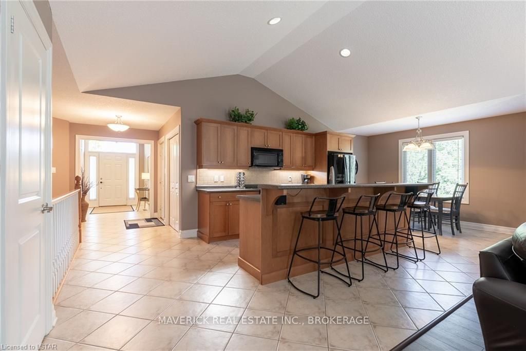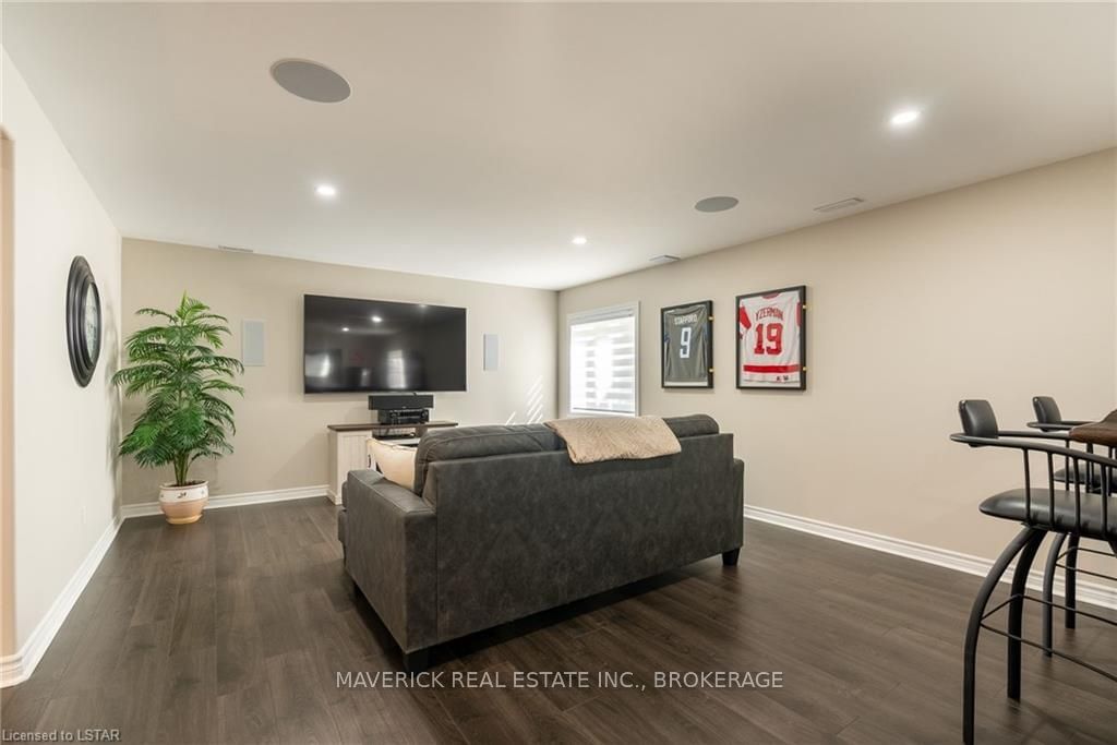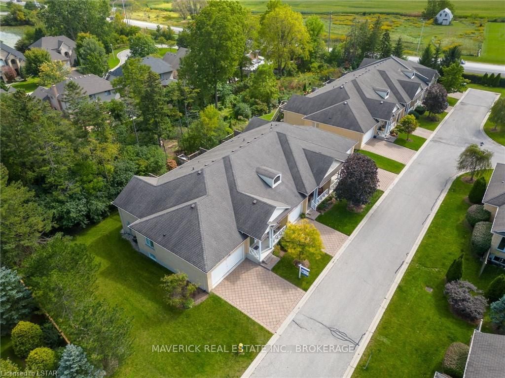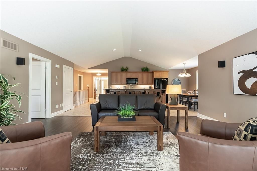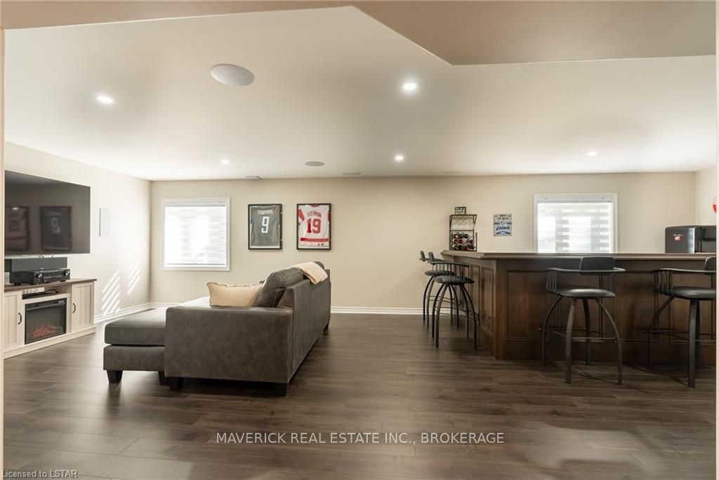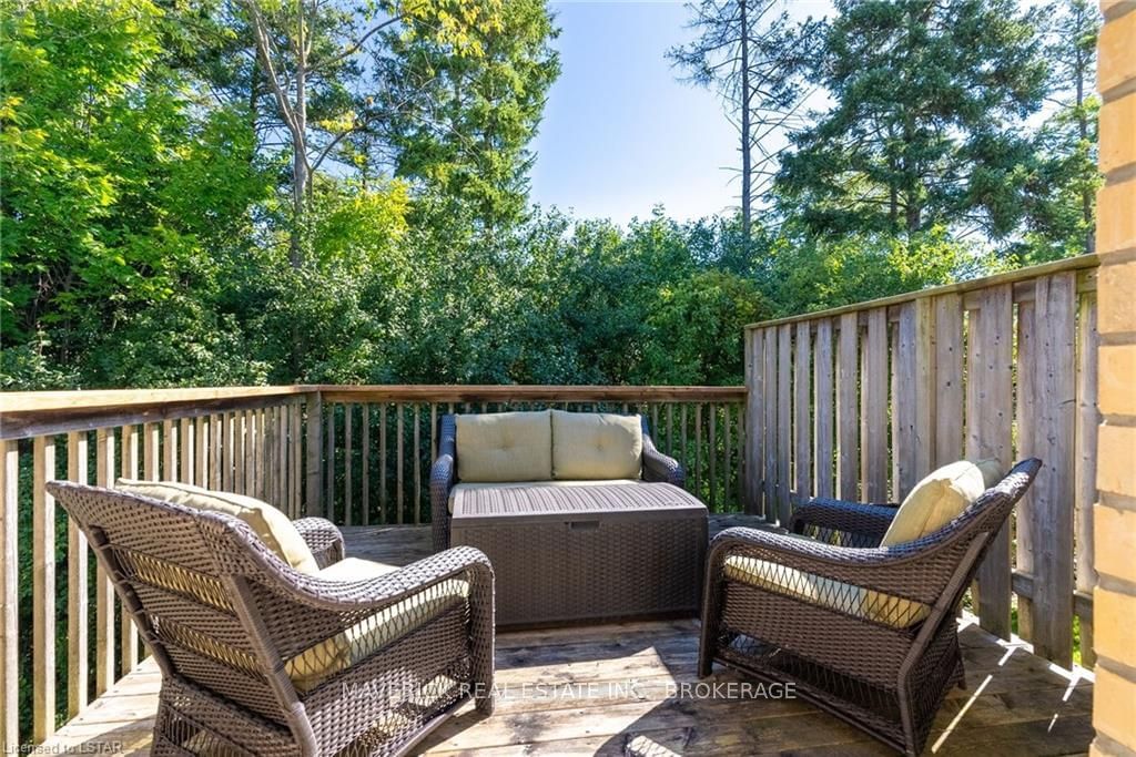 48 HR ESCAPE CLAUSE- Introducing a stunning gem nestled in a quiet community, this solid brick one-floor condominium offers the perfect blend of comfort and style. With nearly 1,500 sq ft of above grade living space PLUS a finished basement , this end unit provides a sense of privacy and tranquility. As you step inside, you'll be greeted by a wide open concept design and vaulted ceiling that seamlessly connects the kitchen, dining area, and living room. The spacious kitchen features a breakfast island, ideal for casual dining, while overlooking the inviting living room, complete with a cozy gas fireplace and seven mounted speakers for an immersive surround sound experience. The main floor also boasts a dedicated dining area, perfect for entertaining guests. For those seeking outdoor relaxation, you'll love the access to the elevated fully enclosed deck, offering ultimate privacy and a serene view of the tree-lined back fence. This home has undergone recent upgrades, with all carpets on the main floor replaced with laminate flooring, providing a modern and low-maintenance touch. The main floor features two generously sized bedrooms, including a large primary bedroom with a walk-in closet and a luxurious 5-piece ensuite bathroom. The convenience of main floor laundry is also found in the common 4 pc bathroom. The basement of this home has been professionally finished in 2021, featuring recessed LED pot lights and a custom cherry bar with an additional separate wet bar, perfect for hosting gatherings or enjoying a relaxing evening. An additional bedroom with a closet offers flexibility and extra space as well. The basement also showcases large 4ft x4ft windows that welcome loads of natural light and provide beautiful views of the green space behind, creating a peaceful ambiance. Four built-in speakers complete the basement's impressive features. If one floor living in a quiet, peaceful neighbourhood in the West end of London is what you are looking for, this is it!