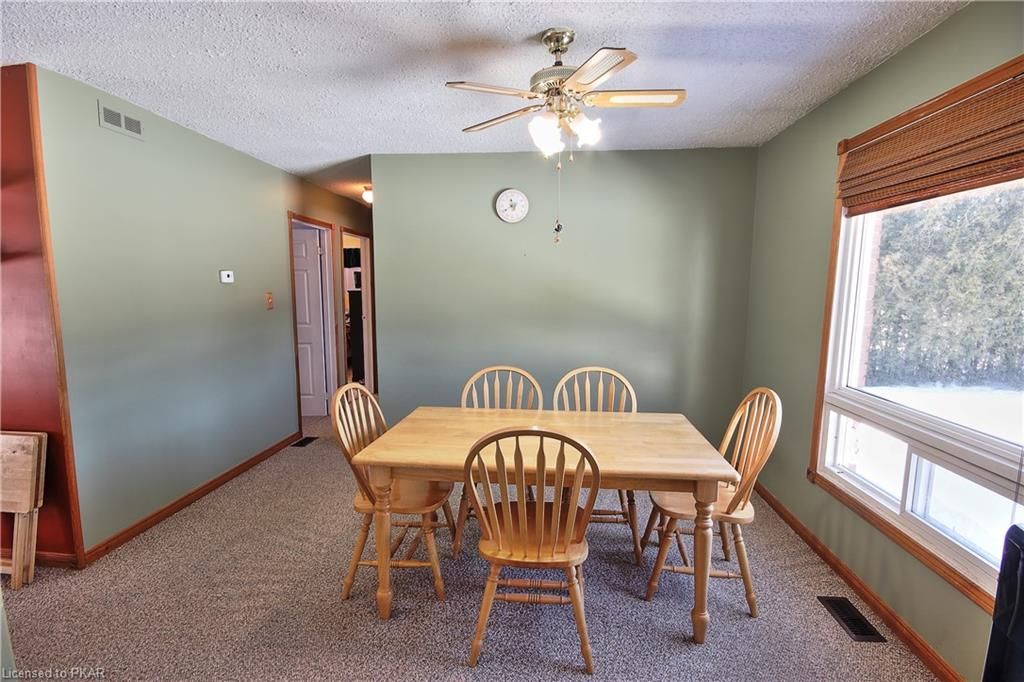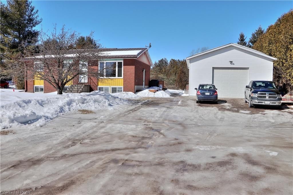 Located just a short drive east of Peterborough on the edge of the village of Warsaw. Built on a large private lot. This elevated 3+1 bedroom bungalow has 2 full baths, finished basement with family room and features a 26 ft x 32 ft detached garage/workshop with high ceilings and oversize garage door. Good size bright rooms, 21 foot eat in kitchen, basement has a 4th bedroom plus a den or office, laundry & 4 pc bathroom. Furnace & air conditioning were updated fall 2020. Shingles on garage are approximately 1 years old, and house has metal roof approximately 8 years old. Beautiful large lot for the kids or pets to play. The area has lots of places to go and things to do for the outdoor enthusiast with Warsaw Caves and park close by, plus there is a beautiful river that flows throught the village.